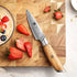 The handle of the knife is made of high-quality olive wood, which is not only known for its robustness and durability, but also for its unique grain and warm coloring, which gives each knife an individual appearance. The ergonomic shape of the handle ensures comfortable and safe handling, making the knife a reliable partner for all cutting work.