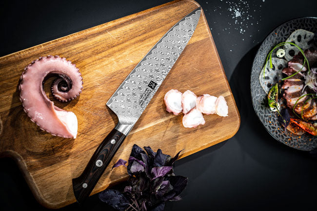 Verwenden Sie eine weiche Schneideunterlage, um die Klinge zu schonen. Bewahren Sie die Messer sicher auf, schärfen Sie sie regelmäßig mit einem Wetzstab oder Schleifstein und vermeiden Sie harte Oberflächen.